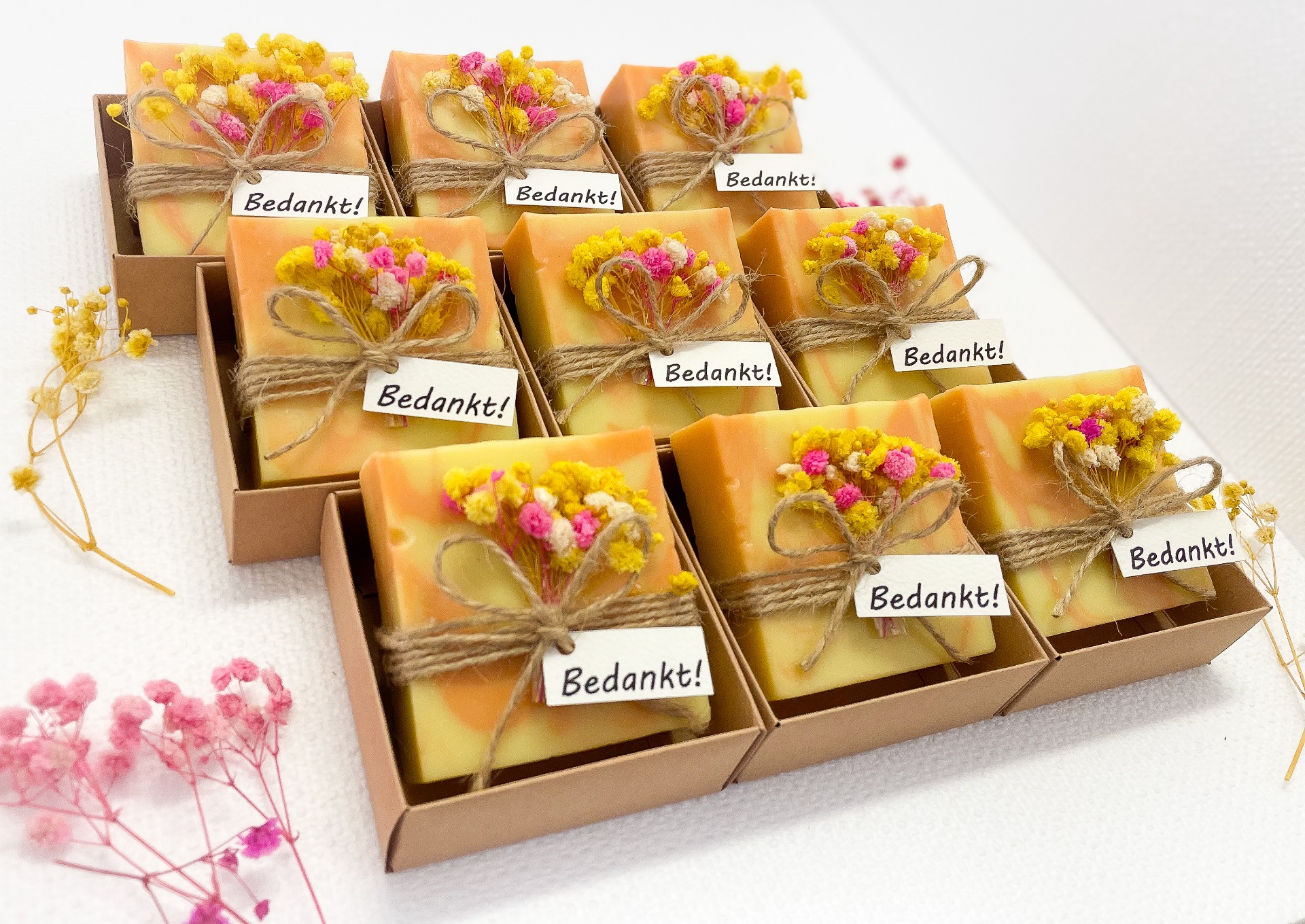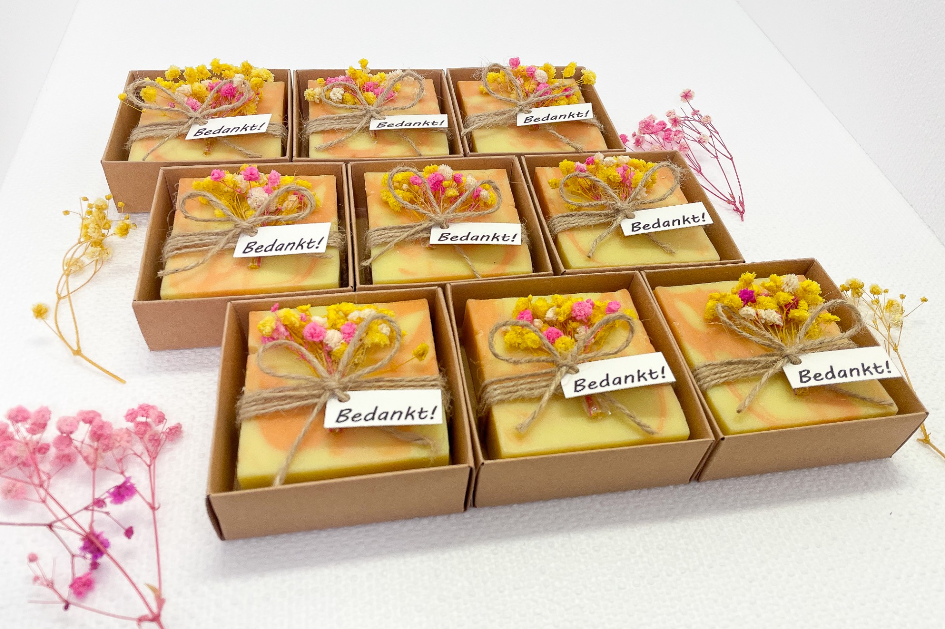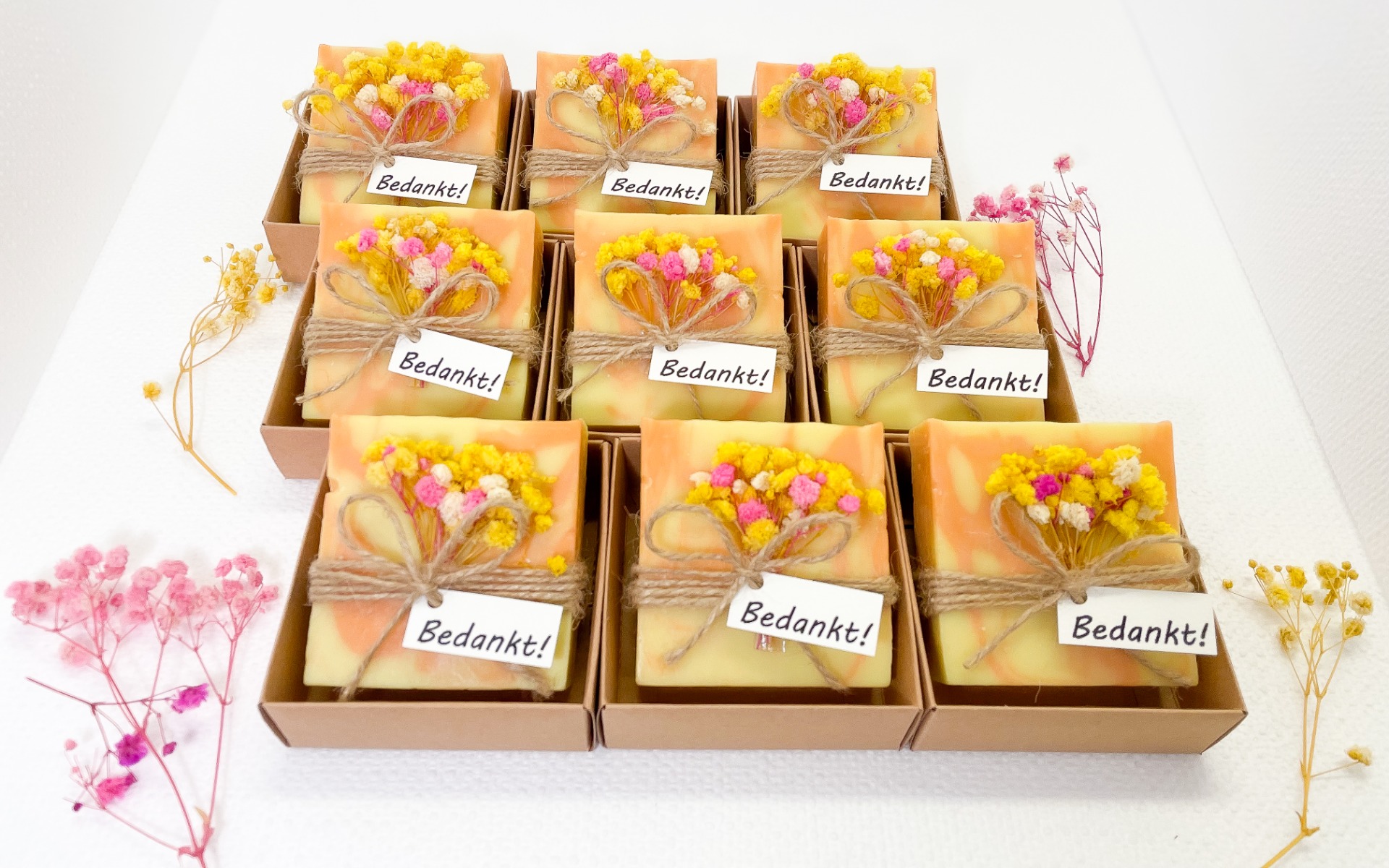 Afwerking: echte gele en roze gedroogde bloemetjes en label "Bedankt!"